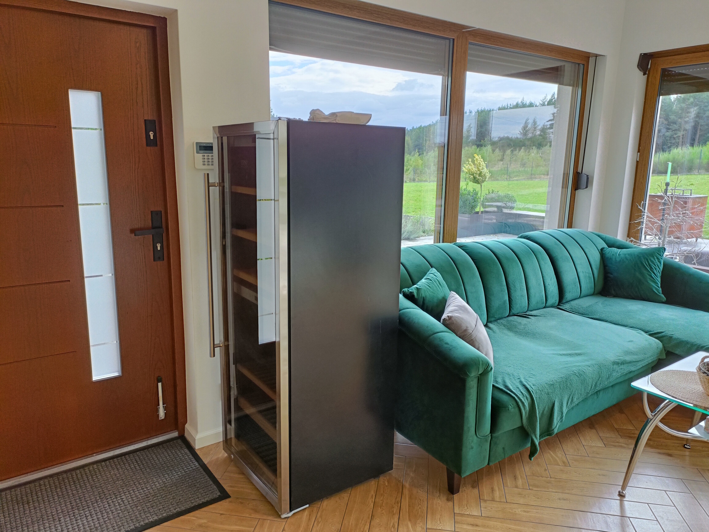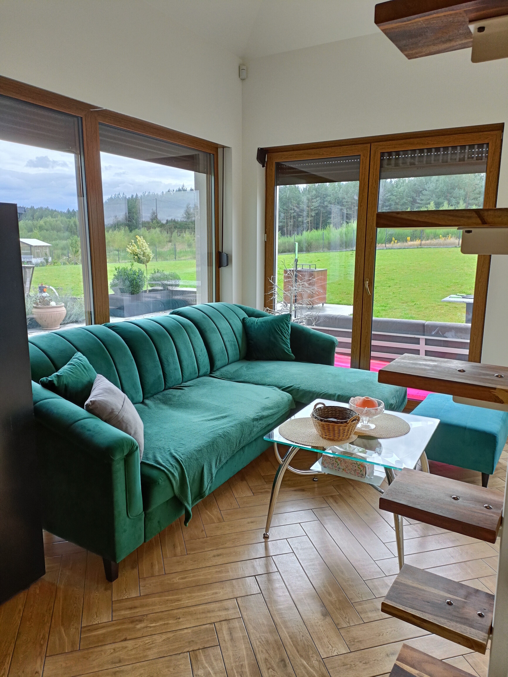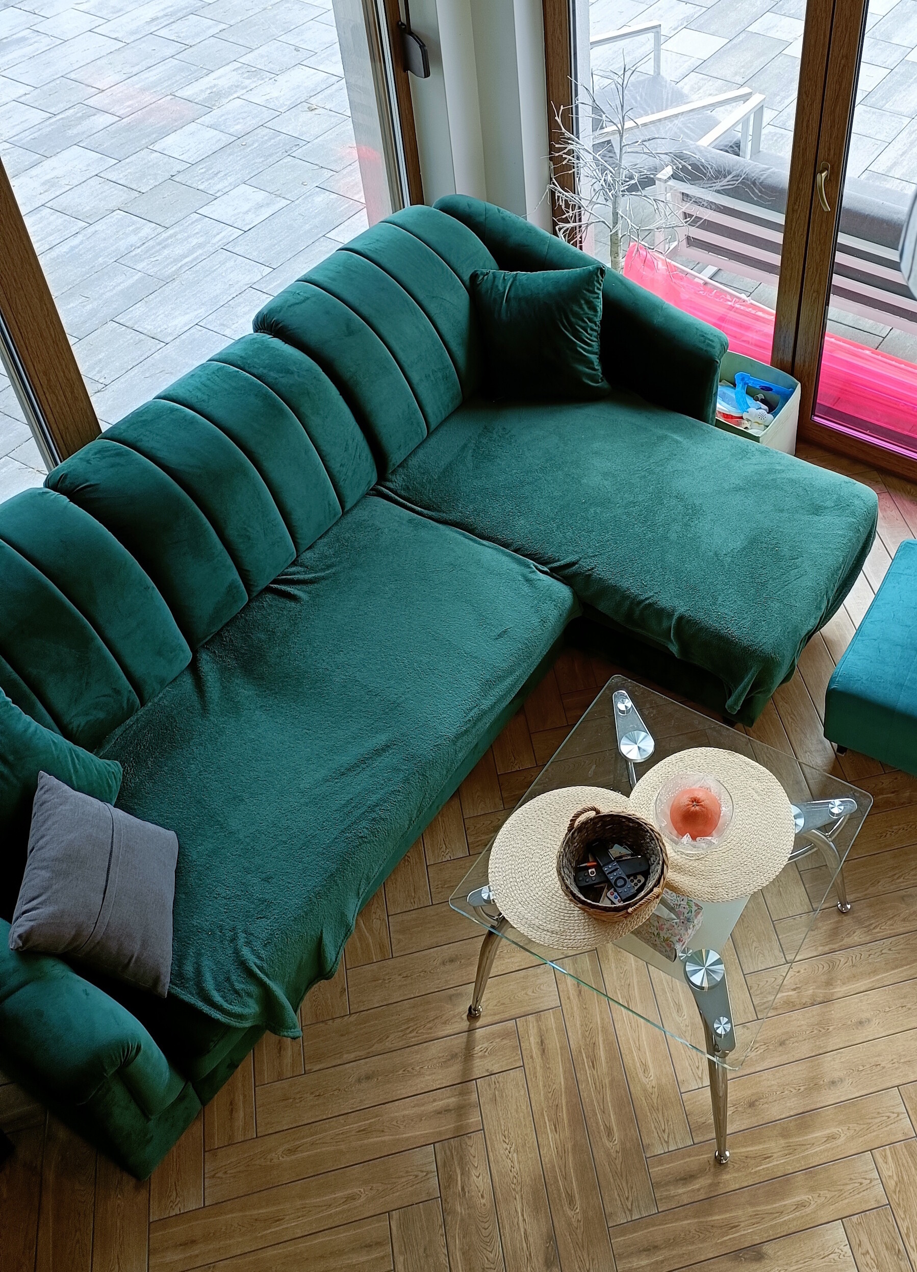 • w salonie rozkładany narożnik z pufą oraz szklany stolik kawowy,