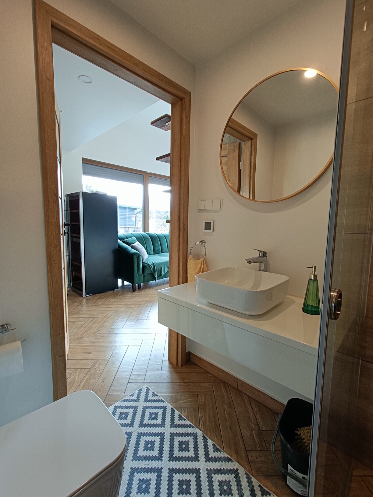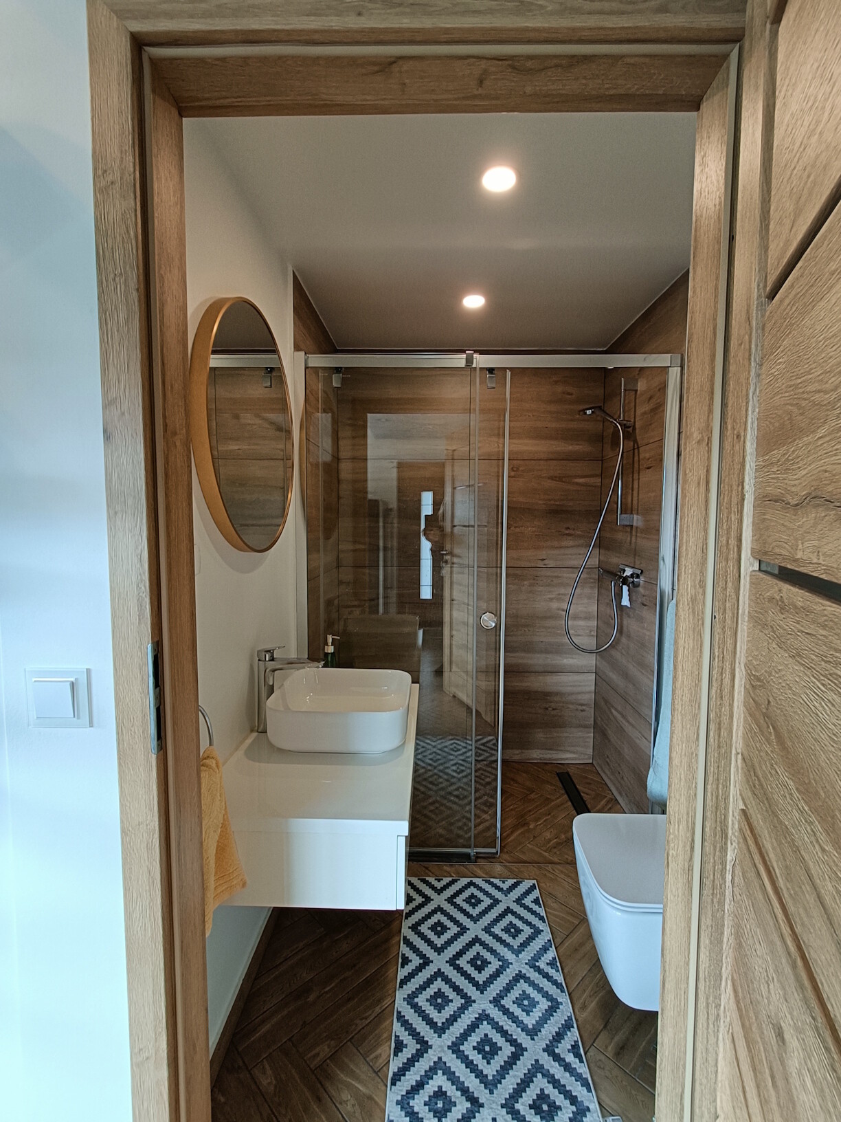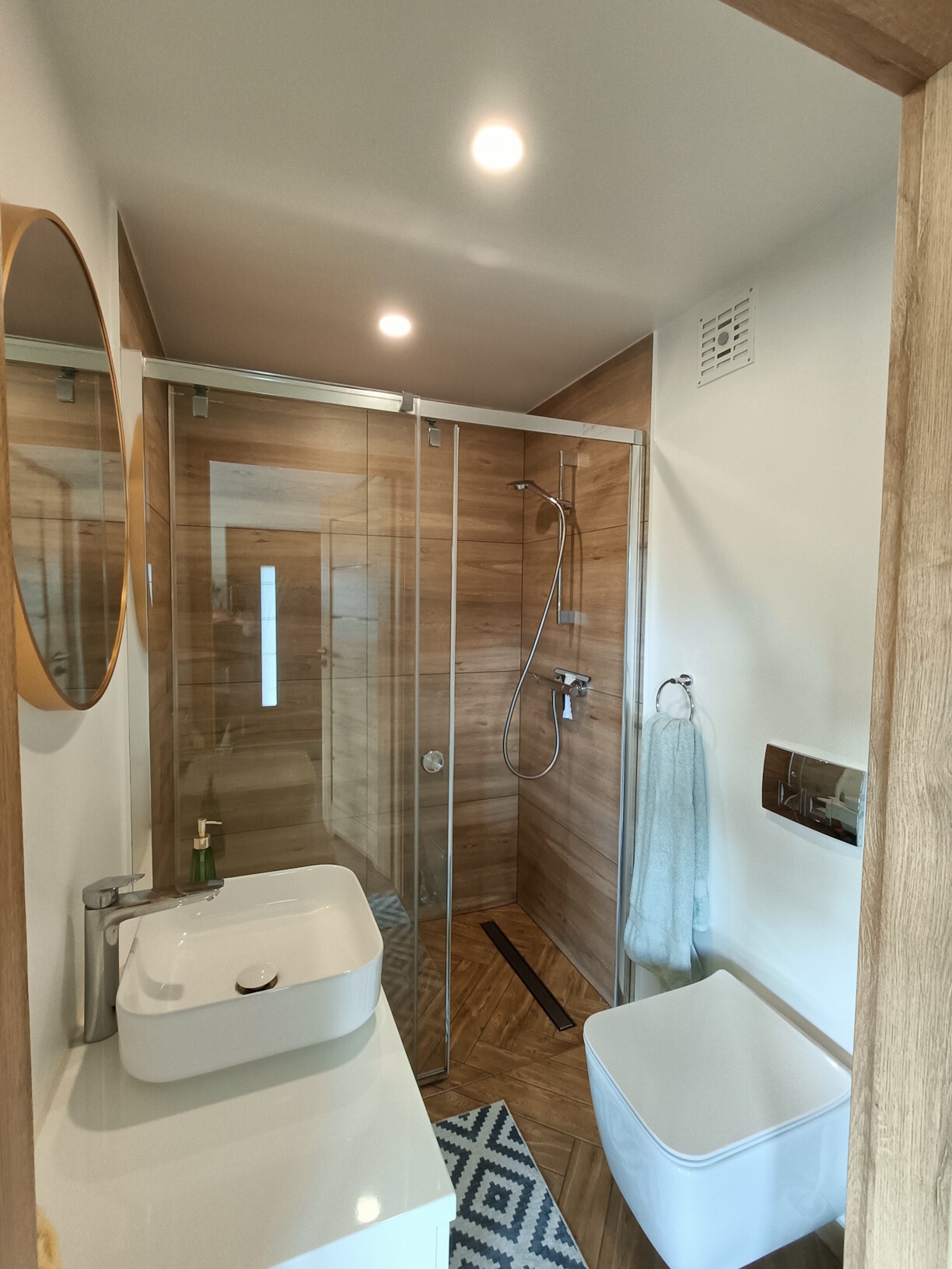 • łazienka wykonana w nowoczesnej aranżacji, jasne alementy łączone z drewnopodobną glazurą, wyposażona