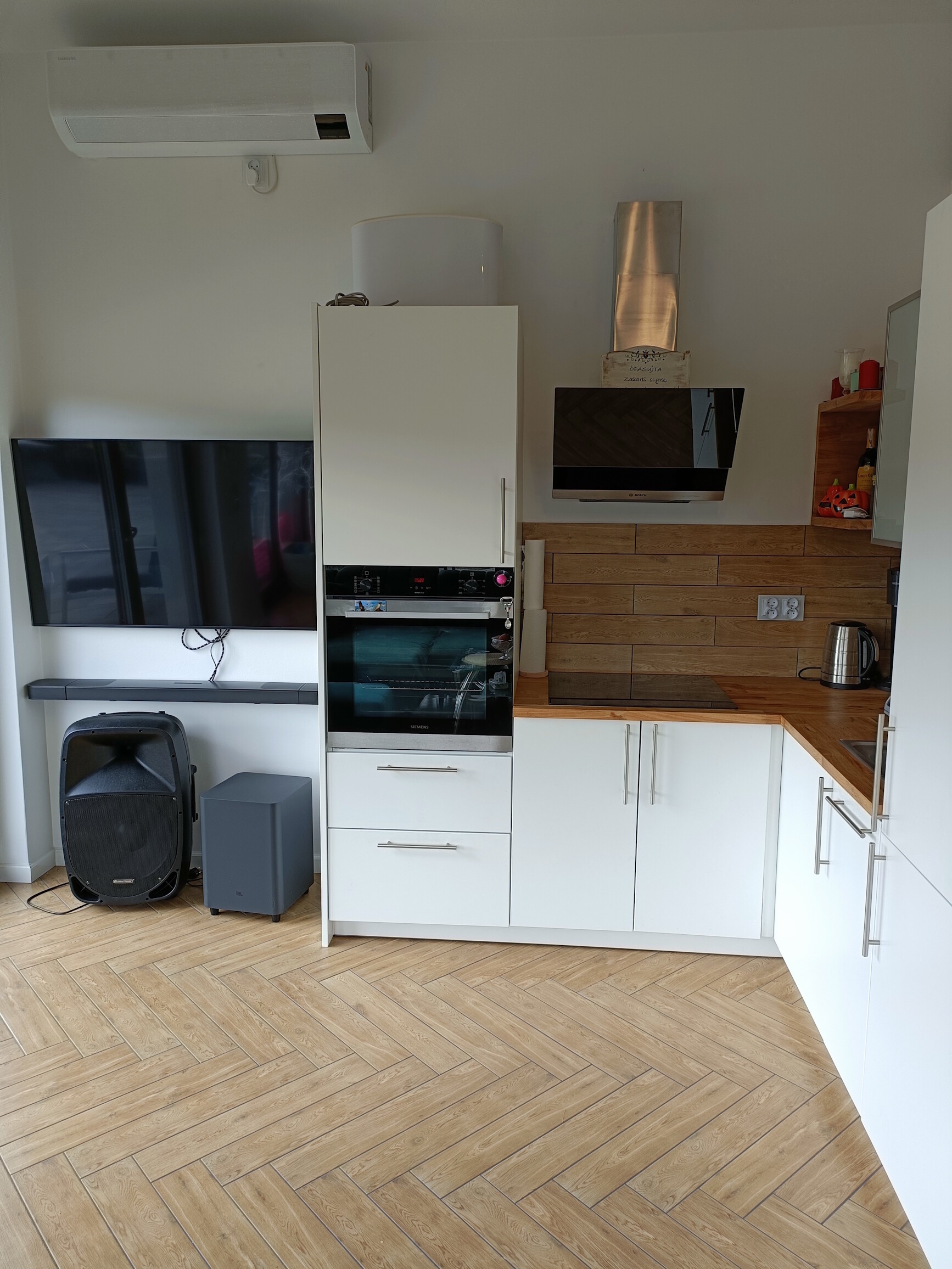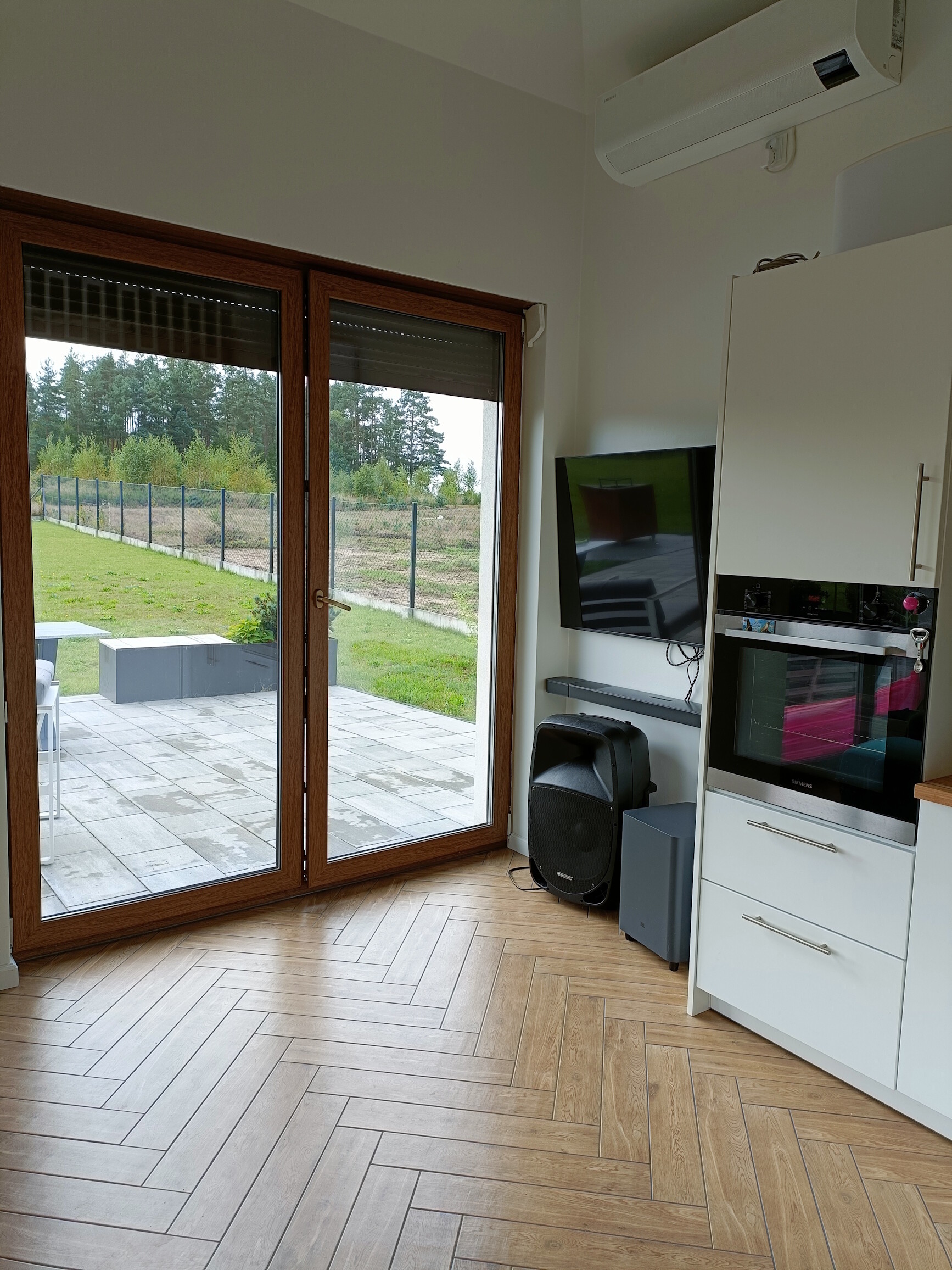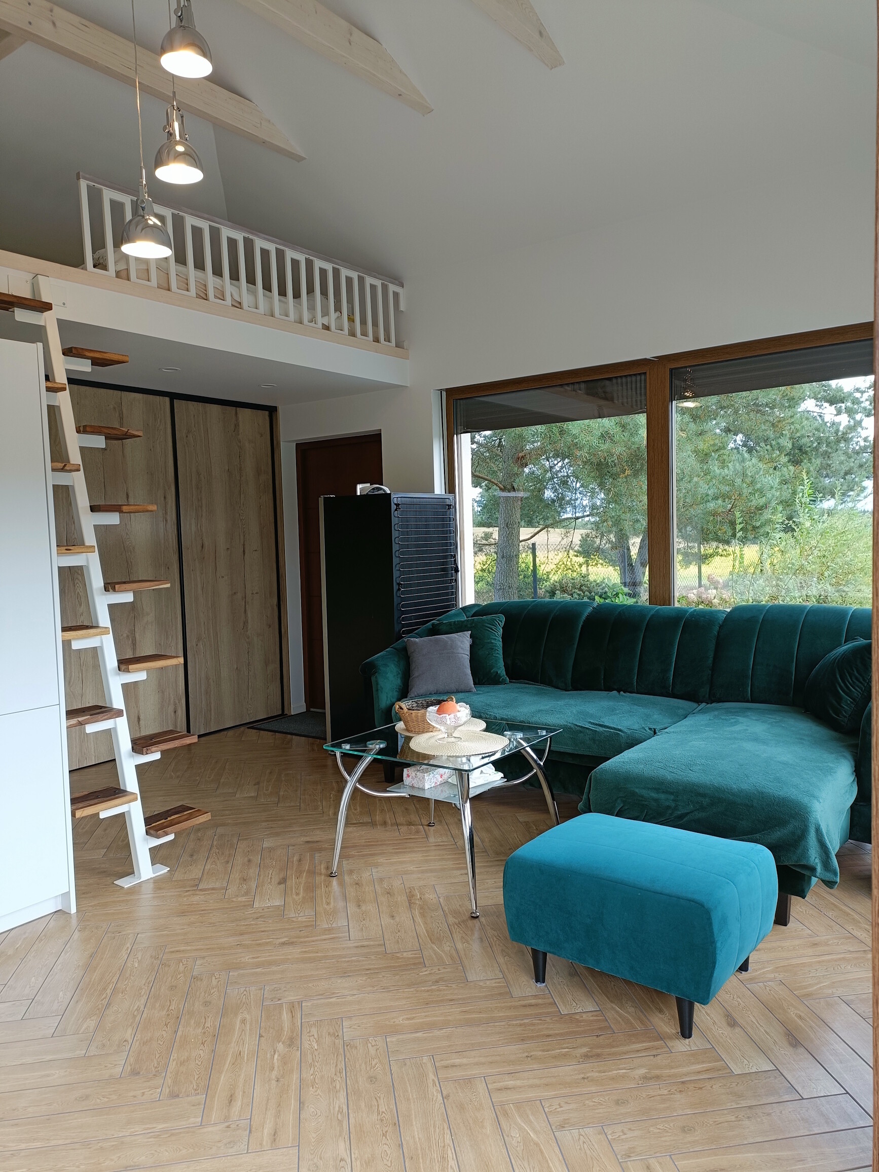 • salon z aneksem kuchennym z pełnym wyposażeniem: płyta indukcyjna, piekarnik, lodówka w zabudowie
