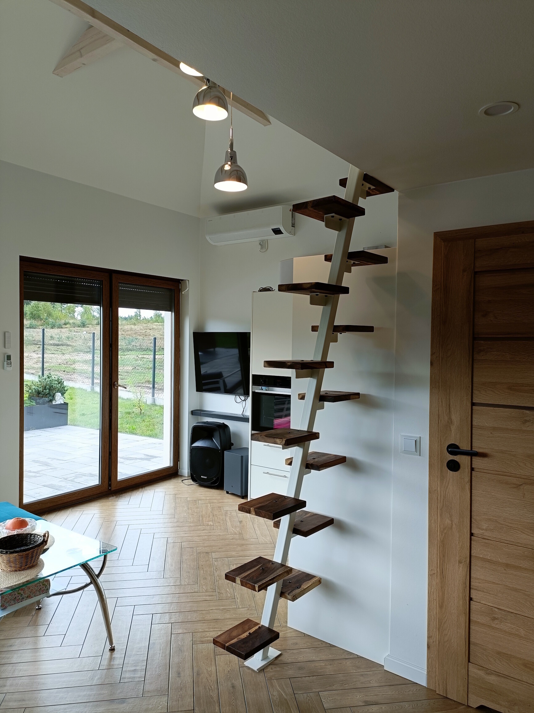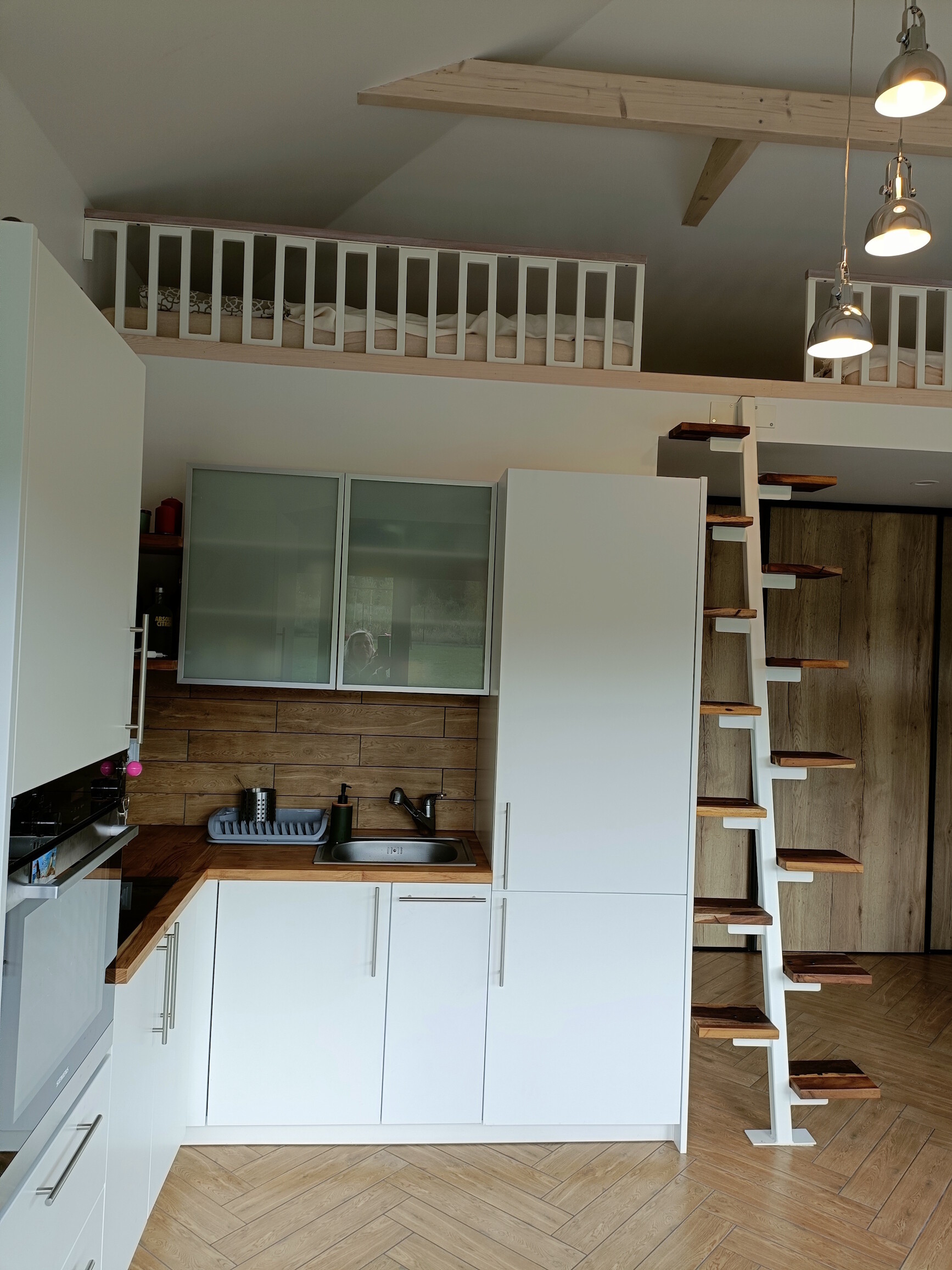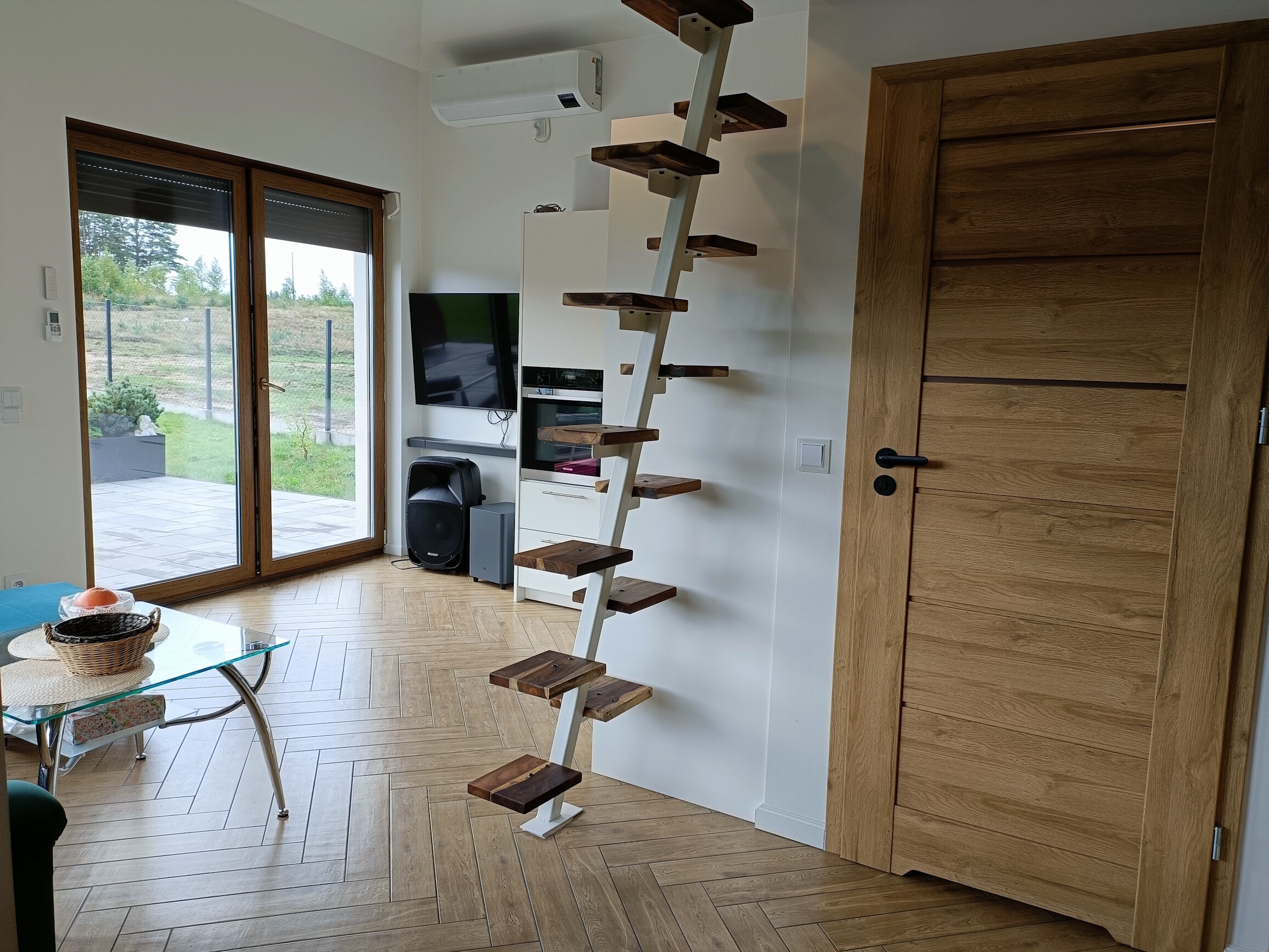 • salon z aneksem kuchennym z pełnym wyposażeniem: płyta indukcyjna, piekarnik, lodówka w zabudowie
